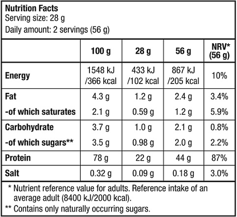 Namena: Proteini doprinose razvoju i održavanju mišićne mase i normalnih kostiju. Preparat se preporučuje za specijalnu ishranu sportista izloženih velikim fizičkim naporima.